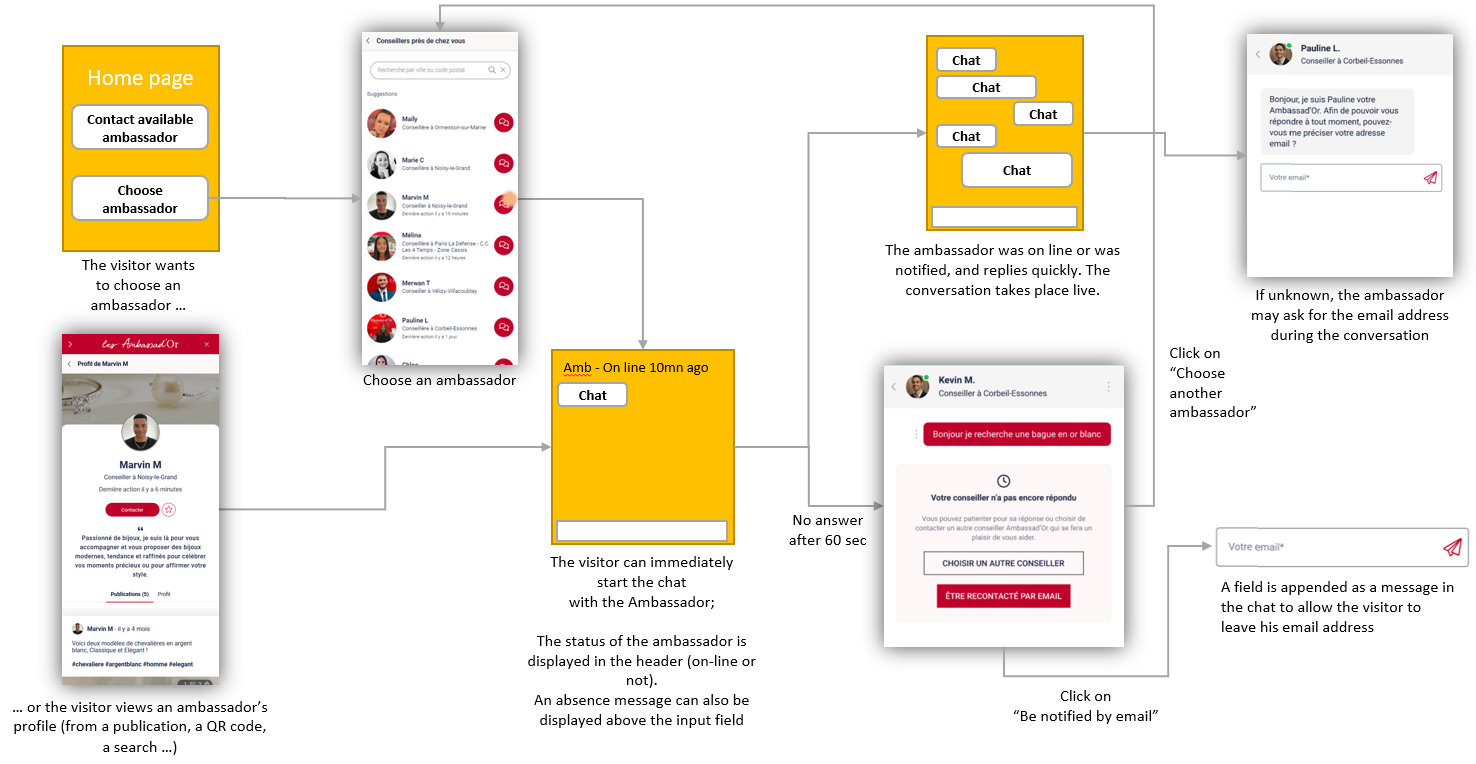 A direct conversation can be initiated everywhere the ambassador’s profile is displayed : on the profile widget, on the publication widget or on the community widget.Conversation through the waiting list: the visitor wants to connect with the first available member, without having to choose. His request is apended in a waiting list, that members are able to pick.