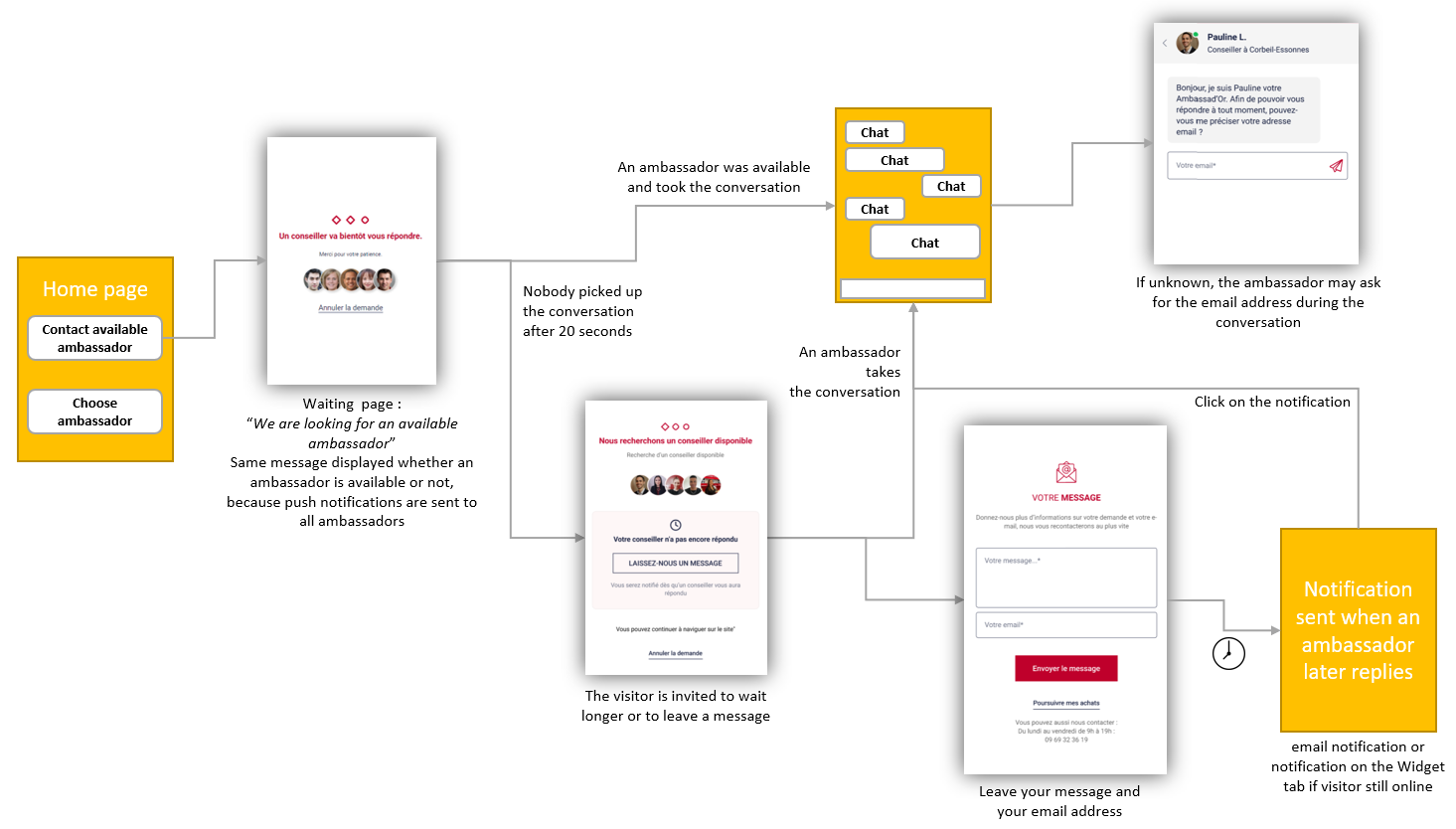 If the customer has written at least one message, but got no answer from the ambassador within 60 seconds, an automatic message is displayed, inviting him to contact another ambassador, or to leave his email to get notified when the ambassador replies later on.